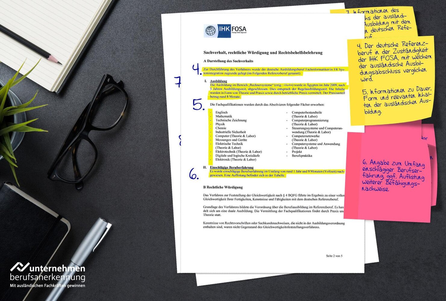 Im Berufsanerkennungsverfahren wird untersucht, inwieweit ein ausländischer Abschluss mit einem deutschen Referenzberuf übereinstimmt. Der Anerkennungsbescheid bescheinigt das Ergebnis dieser Prüfung.